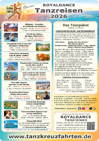 Sie lieben das Tanzen, haben im Alltag aber oft zu wenig Zeit sich Ihrem Hobby zu widmen? Verbinden Sie doch Ihr Lieblingshobby mit einer unvergesslichen Urlaubsreise mit Gleichgesinnten! Alle von uns angebotenen Reiseziele bieten ausgezeichnete Tanzmöglichkeiten und Tanzunterricht bei erfahrenen Profis und Tanzlehrern. Hier geht's zu einer ausführlichen Beschreibung für alle Neu- 'ROYAL- Dancer'.